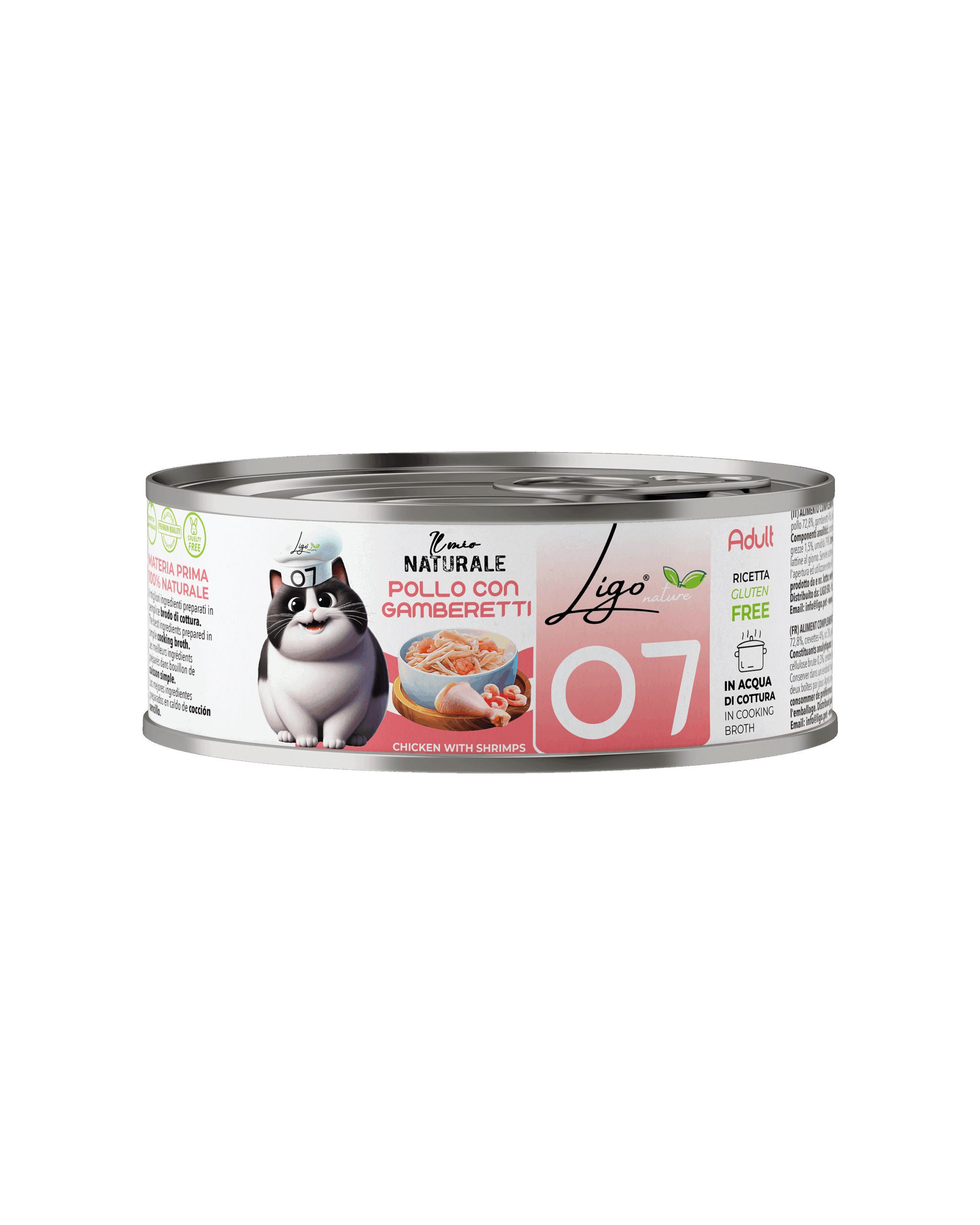 (IT) ALIMENTO COMPLEMENTARE PER GATTI ADULTI. Composizione: filetti di pollo 72,8%, gamberetti 4%, riso 3%, proteine idrolizzate 1,58%, tapioca 0,58%. Componenti analitici: proteina 17%, grassi grezzi 0,5%, fibre grezze 0,3%; ceneri grezze 1,5%, umidità 79%. Istruzioni per un uso corretto: somministrare fino a 2 lattine al giorno. Servire a temperatura ambiente. Conservare in frigorifero dopo l’apertura ed utilizzare entro 48 ore. Da consumarsi preferibilmente entro, prodotto da e nr. lotto: vedere fondo lattina.
